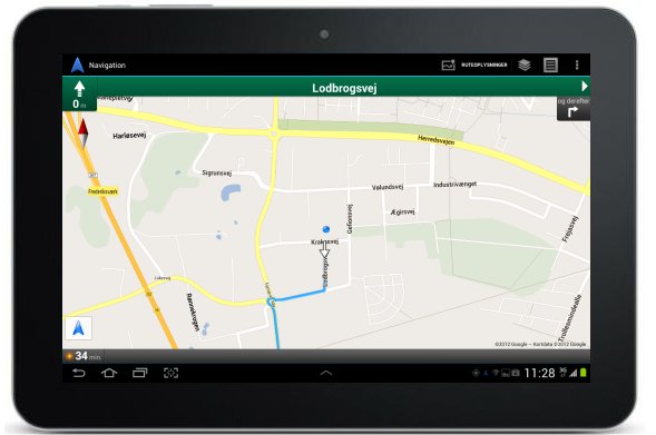 MapFleet APP på Android tablet, hvor der benyttes Google navigation.